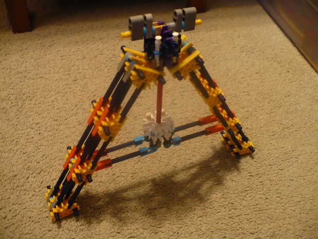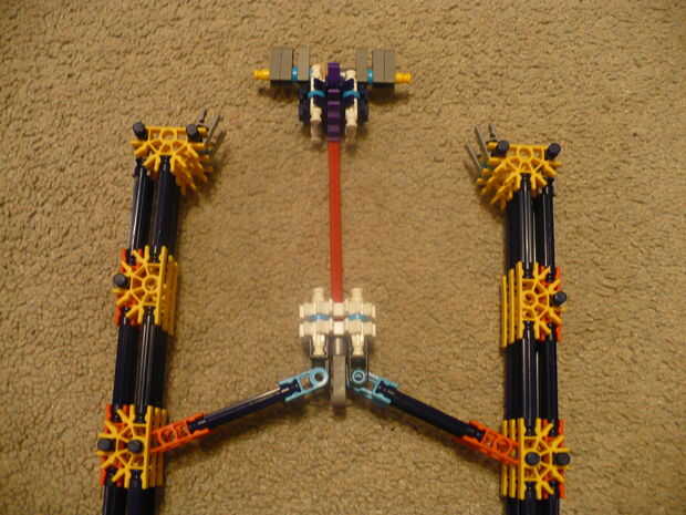 14. Conecte los conectores grises que están colgando de la parte superior de las piernas a las barras blanco sobresale el conjunto superior. Esto debería hacer que las piernas capaces de pivote.