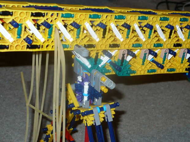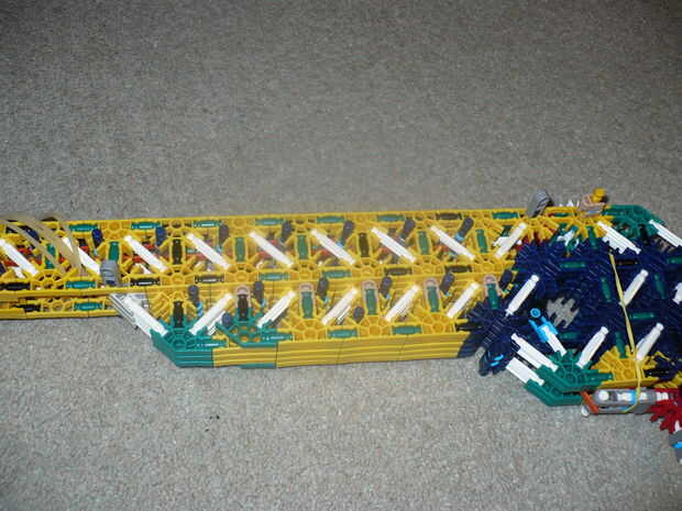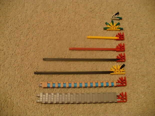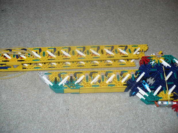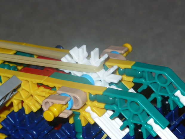 Debe ser bastante sencillo si alguna vez han construido cualquier pistola de k'nex antes de colocar el proyectil. El proyectil debe tener un gancho en él que se pega para arriba sobre el barril para las bandas de goma tubería de goma elástico para prenderse. Utilizar conectores rojo para hacer esto. Inserte el gancho es la parte posterior del cañón y deslice en el espacio al final del cañón que es más estrecho que el resto del cañón. Cuadro 9 muestra un surtido de algunos proyectiles han diseñado, pero recuerda que esta arma disparará casi cualquier cosa que puede caber en el cañón.