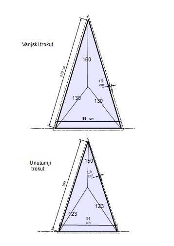 OK, mi tienda se efectuará de 8-ángulo inferior y 8 triángulos idénticos (interno más pequeño) y 8 (externo-más grande), donde uno se efectuará de mosquitero y puerta en la capa interna. Que también provisto de ventilación en la Cumbre de la tienda, 4 en capa y 2 en la capa externa. Aquí está el dibujo y medición de cada triángulo.
