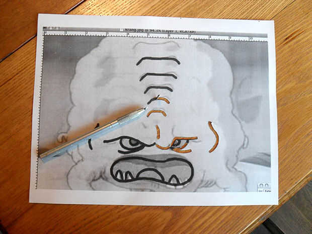 Por ahora, deje algunos puentes de papel que mantengan los ojos conectados. Corte alrededor de la forma de la boca completamente y póngala a un lado.