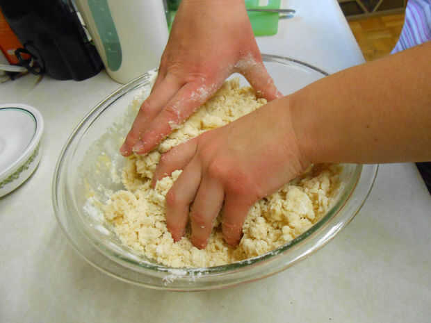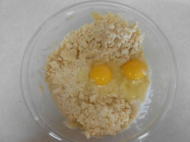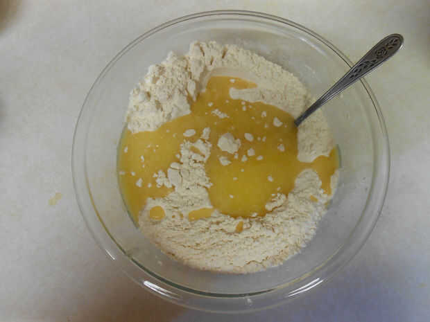 Añadir la mantequilla fundida y mezclar hasta que se parece a las migas.