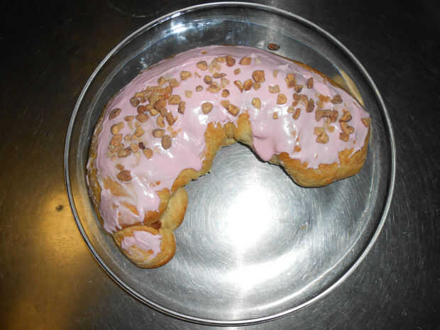 Las heladas su kringle almendra con su elección de esmalte y tapa con almendras trituradas o cerezas al marrasquino.