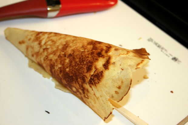 Retire de la sartén. Muy rápidamente (y sí, se quema los dedos un poco) rollo en forma cónica. Asegúrese de que la costura está en la parte inferior y presione abajo firmemente con sus palillos.
