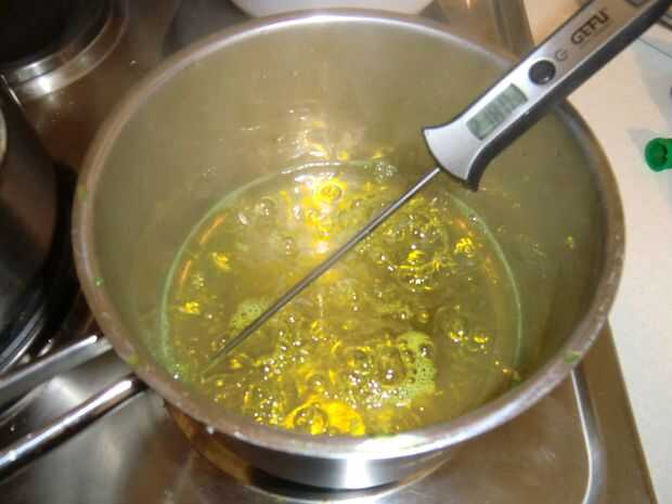 Si no tienes un termómetro de caramelo no se preocupe, usted puede determinar si usted mezcla está lista, tomando una cuchara y dejar que una gota enorme de ella caer en agua fría, si endurece inmediatamente y usted puede romper como el cristal, está listo.