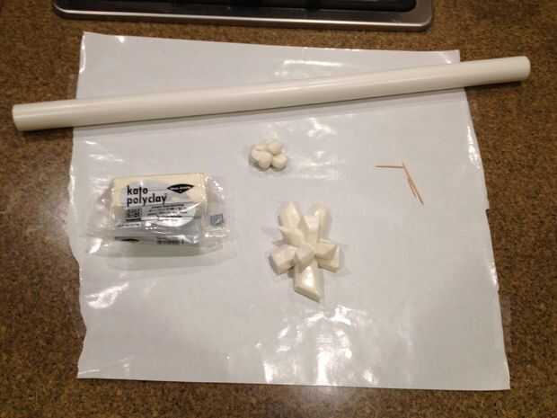 Extiende un trozo de papel de congelador y cinta adhesiva en su mostrador o mesa. Desenvuelva su arcilla de modelado. Usted tendrá que amasar la arcilla para que sea lo suficientemente suave como para formar sus cristales. Usé un pedazo de PVC como un perno de balanceo para ablandar la arcilla. Para formar mi cristales yo rodé longitudes de espesor y cortar con un cuchillo afilado para crear facetas longitudes. I cortar los cristales de variadas longitudes y aplastado los extremos juntos para crear un clúster de cristal. Acabó utilizando palillos de dientes para alisar y moldear las intersecciones de los cristales. Hice 4 diferentes grupos para que mis collares de Kryptonite Nerd botín tendría algunas diferenciaciones.