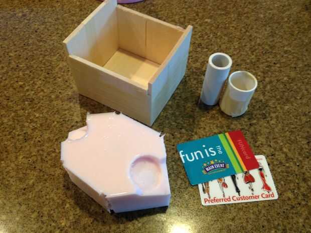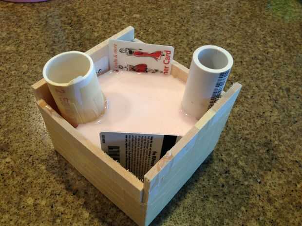 Verás en la imagen que yo tenía algo de espacio extra en mi caja de moldeo. Grabado dos tarjetas de plástico en las esquinas abiertas para evitar la pérdida de silicona y con un molde excesivamente gruesa, menos flexible. También corrí corto de silicona en el momento en que vierte el molde del pasado, así que tuve que desplazar algunos silicona empujando pequeñas piezas de PVC (cierre con cinta en la parte inferior), que elevó el nivel de silicona lo suficiente como para cubrir el último cristal. En retrospectiva, yo debo han hecho en los 4 moldes porque el molde más fino era mucho más flexible y más fácil trabajar con que los moldes de la caja completa. Vivir y aprender.