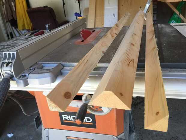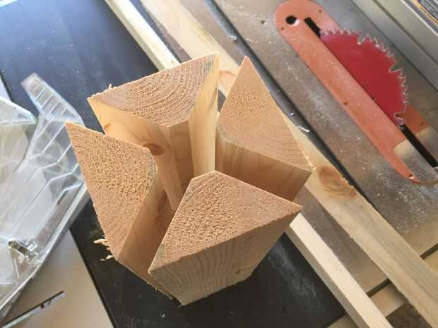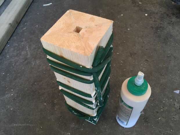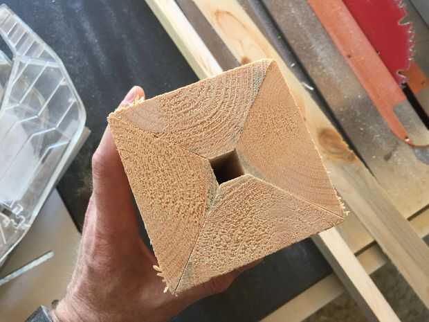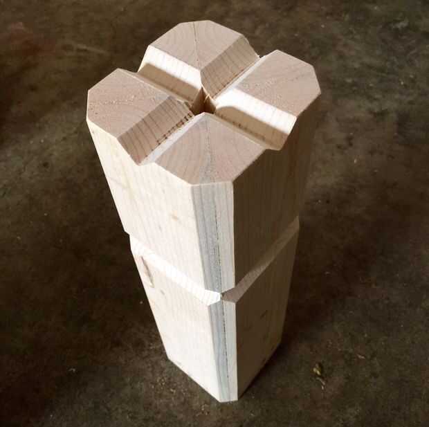 Recortar dos esquinas de 45° de un 1255 mm de largo 2 × 4 para dar una sección trapezoidal. Cortar en cuatro longitudes de 310 mm. Pegamento para formar un cuadrado con lados de 88 mm. He utilizado un tubo de goma quirúrgica como una "pinza". Si te molesta el pequeño agujero en el centro, pegar un trozo de madera cortado a las dimensiones correctas dentro. Recortar todo exactamente 300 mm, y luego tallar decoraciones adicionales para hacerlo tan real como mejor parezca. Continuó con el ambiente octagonal y había hecho algunos biseles con la Sierra de mesa y hecho un adorno cruzado encima a echo un rey de ajedrez.