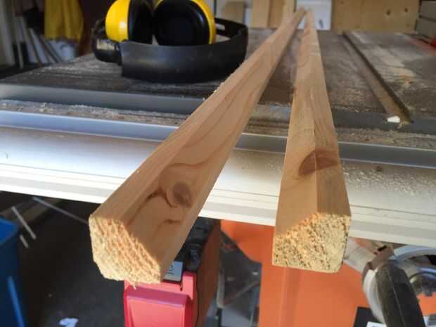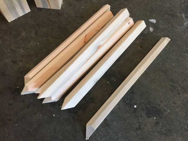 Use los recortes de 45° de ripeo al rey. Recortar los bordes y afilar un extremo (yo usé una sierra para cortar ingletes). Tendrás suficiente para marcar las esquinas y la línea central y tener repuestos. Hice mío 350 mm de largo, cortar los nudos y consiguió siete (1 repuesto). Usarlos para marcar un área de juego 5 pasos de ancho por 8 pasos de largo, con marcadores de centro a medio camino a lo largo del lado más largo. ¿Si te sientes de humor que hace, por qué no hacer un mazo de a libra en el juego?