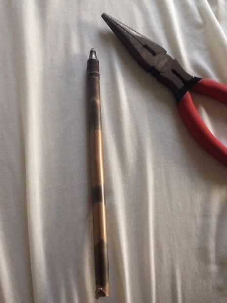Tomar la flecha y poner en un punto del campo, luego cortar o romper para ser aproximadamente 6 1/2" largo, incluyendo el punto del campo. Si usted rompió entonces usted tendrá que reforma el extremo quebrado a ser algo circular con el pliers.it debe tener este aspecto...
