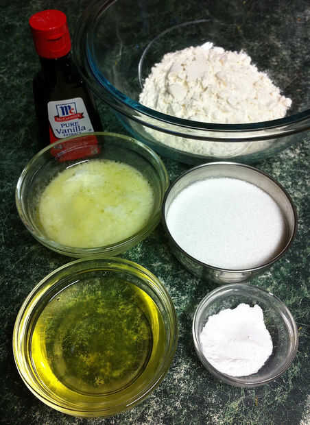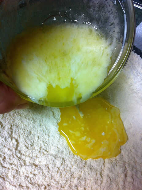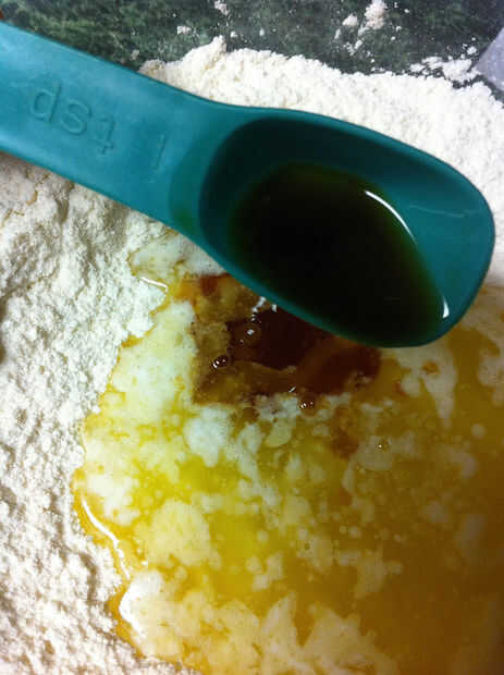 Añadir la mantequilla derretida, el huevo y la vainilla, revuelva para mezclar, pero no vencer.