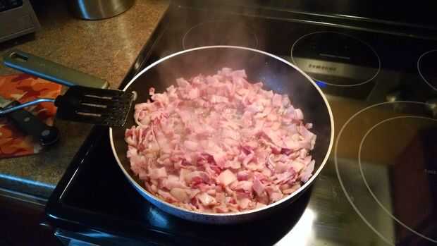 Corte por lo menos una libra de tocino en tiras de.5 pulgadas y freír hasta! toma la placa y corte a través de la forma de tira larga para hacer las piezas.