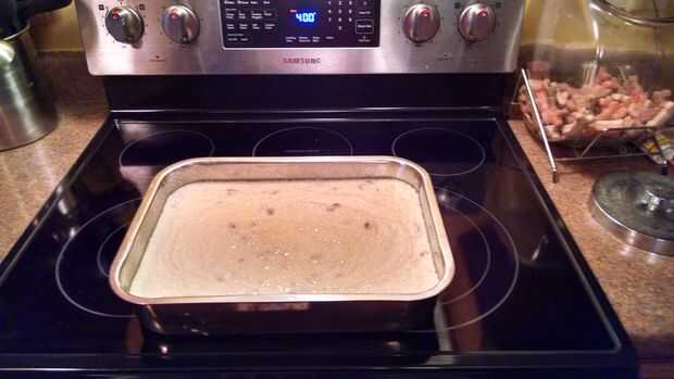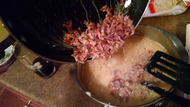 Una vez que termines con tus lotes, añadir el bacon y evap leche a la mezcla. Revuelva después vierte en el molde que preparaste. No trate de verter inmediatamente, porque mierda salpicar por todo el lugar. Poner en un horno de 450 grados durante 30 minutos y luego deje caer a la temperatura a 350. Cocine una hora o hasta que la parte superior es de color marrón tostado.