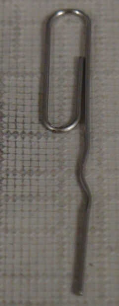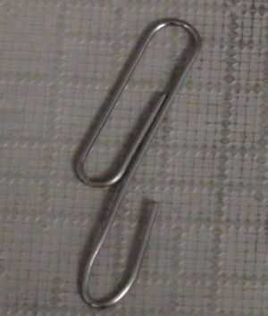 Doblar hacia atrás el lado abierto de la clip como se muestra en la foto tres y rosca en el orificio como la foto cuatro muestra, la grapa que mantengo está allí para que pueda ver donde debe sentarse el clip.