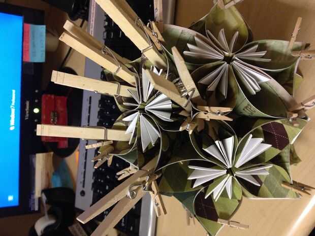 En este punto hubo sólo dos flores izquierdo, el superior y el inferior. Pegar la parte inferior en todos los 5 pétalos y cubrió en lugar de la pelota. Usé pinzas para la ropa regulares porque no pude llegar a la parte posterior de estas flores, y llegan ya.