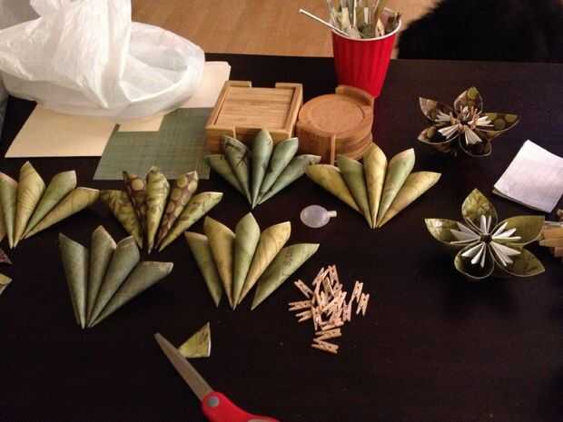 Para hacer una bola de flores Kusudama que necesitaba hacer 12 flores kusudama individuales, cada una con cinco pétalos, de un total de 60 pétalos. Quería la bola a ser bastante grande y robusto, por lo que optó por reciclar una gran variedad de izquierda más páginas de scrapbooking en lugar de usar papel de origami. Las páginas de scrapbooking eran más gruesas y tenían interesantes diseños. Utilicé colores en la boda. Son todos los tonos de verde y marrón. Cortar cuadrados de papel 60 6 pulgadas por 6 pulgadas de las páginas (Nota: la araña, debo han hecho más grande. La próxima vez pienso hacer los 8 por 8 o más para crear más espacio para la luz y mayor distancia entre la bombilla y el papel).