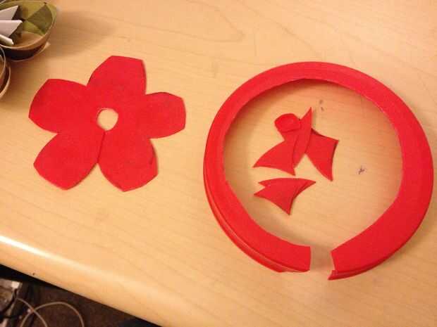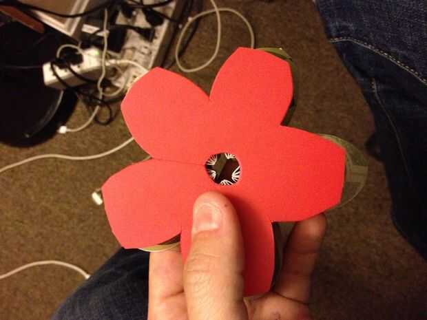 Usa una luz de LED, no creo que me haria falta este paso pero lo diseñado originalmente la flor superior final para tener un "calor" del protector debajo. Corte la parte superior de una tapa de botella grande pretzel y cortar en la misma forma que la parte superior de la flor. También corté un agujero en el centro para permitir que el cable ir a través. Planeé pegar la flor base para la protección contra el calor.