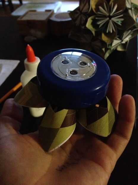 La última flor (uno que era la parte superior de la araña) es la flor de fondo a este diseño. En primer lugar de recortar las puntas de los pétalos para que la flor se pone plana sobre la mesa cuando boca abajo. Pegado un empuje de LED luz para la parte posterior de la flor y ponerlo sobre la mesa