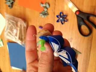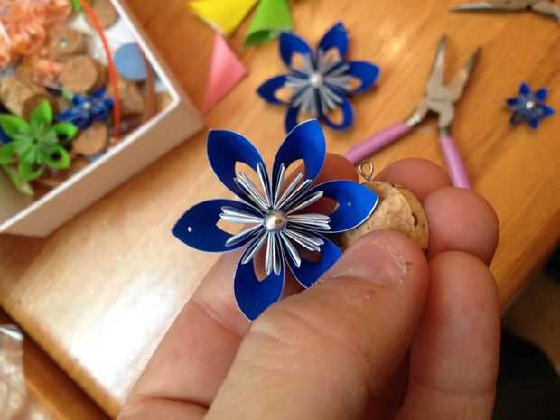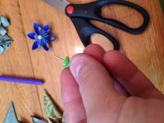 Usé una chincheta pequeña hacer un agujero en el ornamento de Kusudama. Nota: antes de empujar a través llevó a cabo el pétalo con un corcho del vino para que no deforme el pétalo en el proceso.