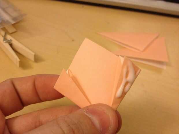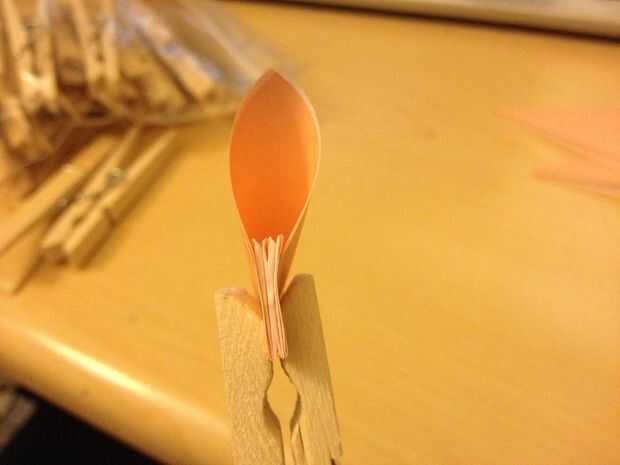 Doble las aletas laterales por la mitad para ocultar las puntas que sólo plegada. Agregar el pegamento al borde y doble juntos. Use ropa alfileres para unir durante unos 15 minutos. Esto hace un pétalo.