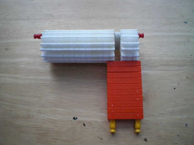 24 requiere KVG piezas, dos pequeñas bandas de goma y algunas pequeñas bandas de goma para munición (trabajo de bandas de refuerzo).Paso 1: El mango Paso 2: Cañón y disparo Paso 3: Mecanismo de carga Paso 4: Juntándolo todo Puede que tengas problemas