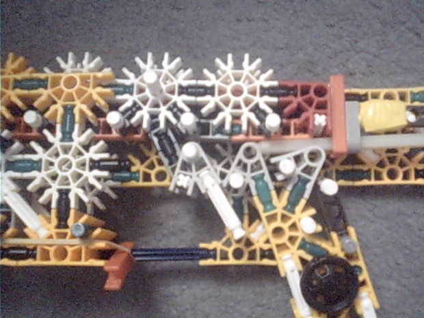 en primer lugar, ver el video y las fotos, mi explicación de abajo explica principalmente salen hacia fuera.Esta pistola funciona con elástico atado con cadena a una rueda, que a su vez está conectada (por la misma cadena) a un conector blanco que ac