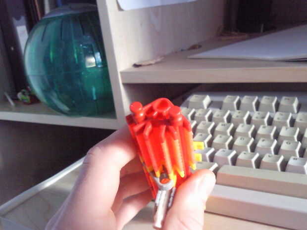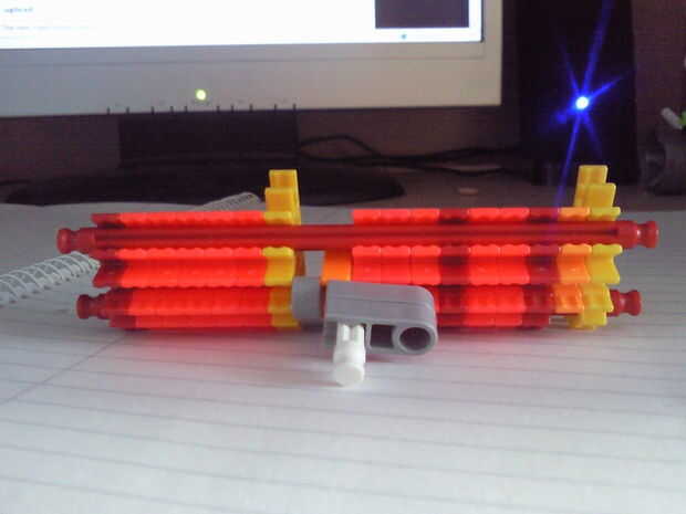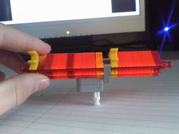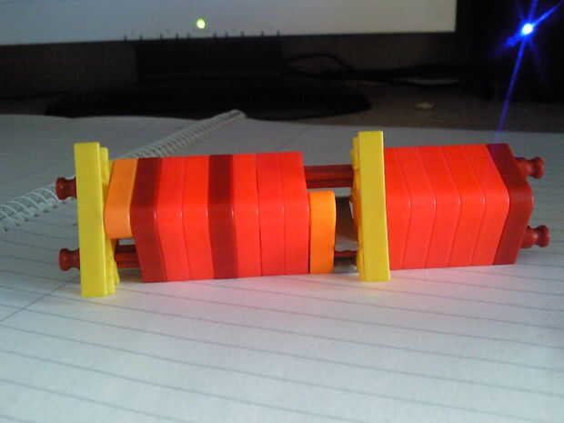Luna Roja de 1 cuarto x6, luego amarillo media luna x1then en la barra roja izquierda es una escalera medio gris apuntando en salas para alinearse con la parte inferior del conector amarillo media luna, entonces en la misma barra un triángulo con el agujero alineado con los otros y luego rojo 1 cuarto Luna x8 luego media luna x2