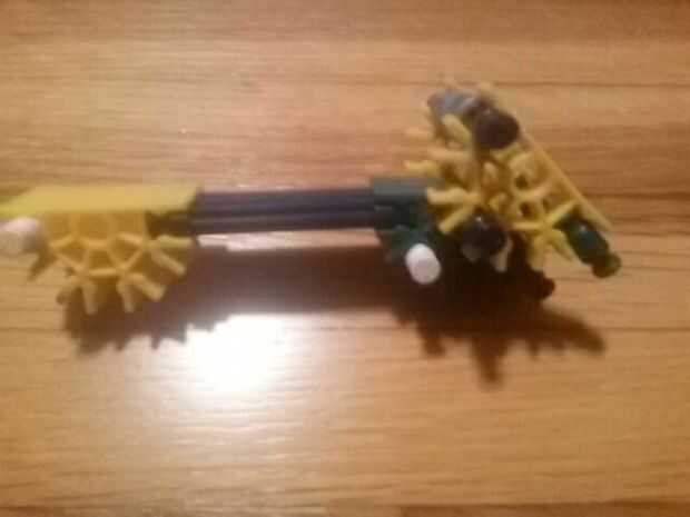 Esta es un arma de KVG que dispara unos 5-10 pies dependiendo de la banda de goma. Se tiene una seguridad y bolsillo. Por favor dígame qué puedo hacer para hacerlo mejor. La munición usada es una caña corta verde.