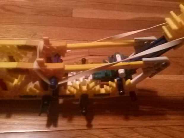 he hecho una ballesta cool que puede disparar +-150 pies.No tiene un gatillo como las otras porque me enteré que se puede utilizar toda la potencia de la ballesta luego.Utiliza las ruedas de repartir el poder en las bandas de goma para hacerlo dispar