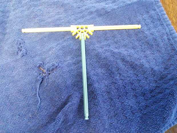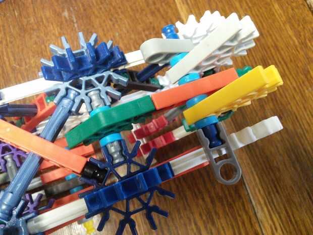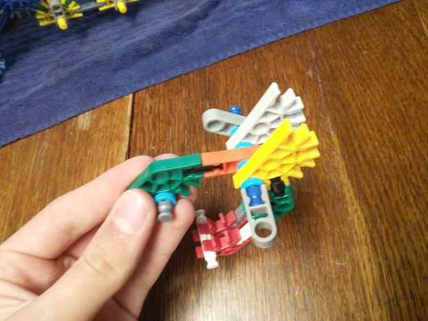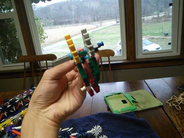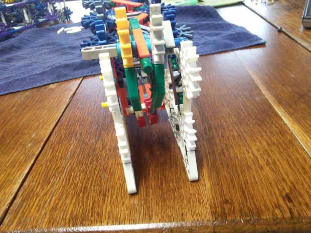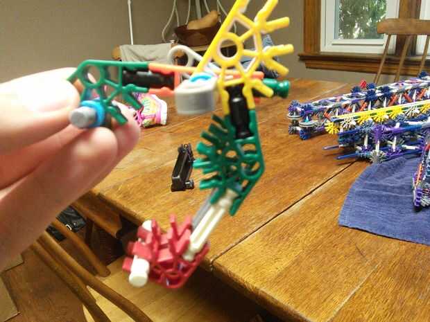 Esta es la parte que será contenida en el caldo, colocar en el riel, sujetar la goma en su lugar y trae el nock en contacto con la goma. También es probablemente la parte más sencilla de construir. Requiere sólo unas cuantas piezas simples. Fije la barra blanca (en el gris de la foto) con los espaciadores y el conector verde de ese espacio vacío que hemos dejado vacíos por tanto tiempo, los conectores de triángulo rojo deben colgando hacia abajo dentro de la población. La palanca es simplemente un conector D, 1 barra roja, 2 barras amarillas en forma de T.