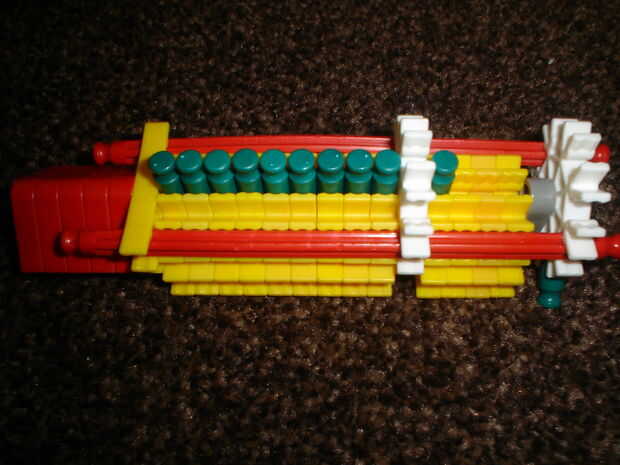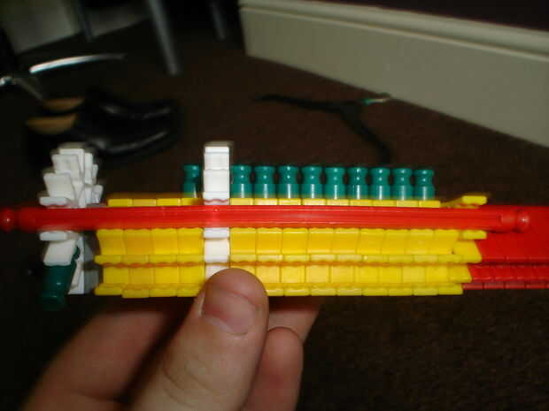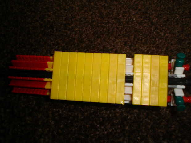 imagen 2, 3 y 4: Añadir un conector amarillo como el rojo y poner 2 barras rojo en ambos lados, luego agregar 9 conectores amarillo a través del orificio como una brocheta de arreglarlos como el cuadro demuestra una vez que ha hecho que añadir barras verdes a los amarillos y luego enganche un conector blanco al conservar en lugar, añadir 4 más amarillos y otra barra verde al primero y luego añadir un conector gris oscuro entonces otro conector blanco