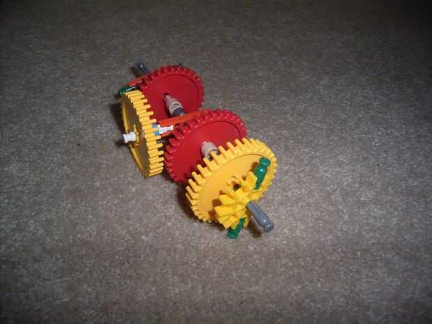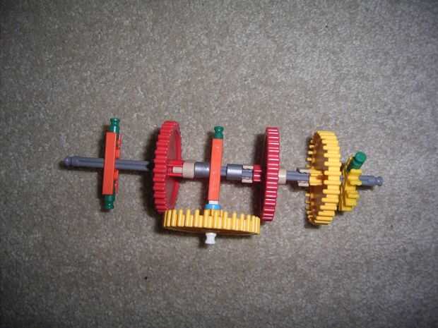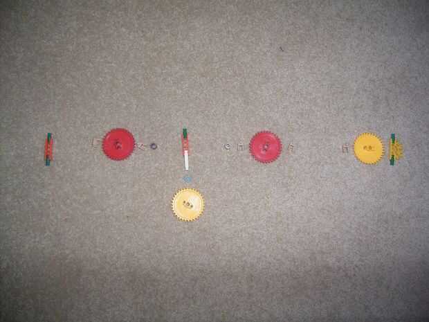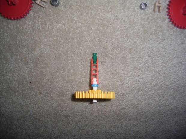 En ningún momento pueden ambos engranajes rojo malla con el equipo amarillo. Para ello, alinee a un espaciador azul al lado del conector naranja como en la cuarta foto. Usted tendrá que reajustar esto al agregar en el coche.