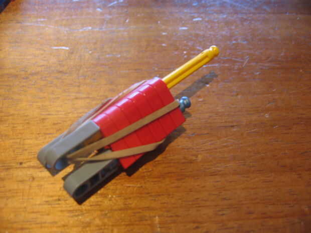 esto es una pistola de KVG diseñé con compartimientos de doble carga que fácilmente pueden disparar más de 40 pies con buenas gomas y pueden progresar con minerales, o de bandas de caucho más fuerte. Puede contener 25 barras azules a la vez, por lo q