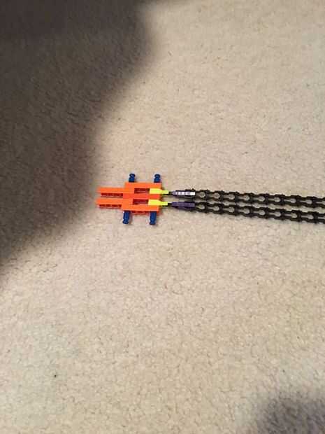 La longitud de la cadena debe ser proporcional a la altura de la torre. Los conectores naranja actúan como un contrapeso para contrarrestar el peso del coche. Si los engranajes negro salta sobre una sección de la cadena, hacer el contrapeso más pesado