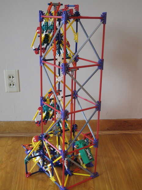 Esta elevación utiliza dos sistemas de armas que se alternan en subir y bajar. Las bolas se desplazan de un lado a otro cuando los brazos se mueven. Utiliza una manivela doble en la parte inferior y un sistema para mantener las bolas en el ascensor.