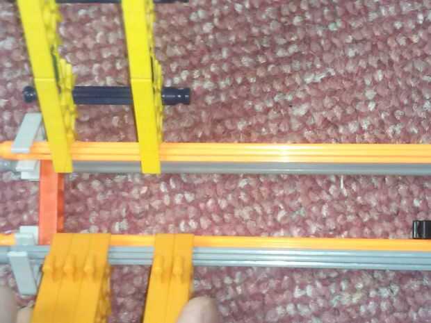 Hola, este es mi primer instructivo! Este camino utiliza bolas regulares y debe tener la velocidad que llega a trabajar.Partes:Barras:Rojo: 1Amarillo: 20Azul: 60Blanco: 13Verde: 40Conectores:Gris oscuro (1 ranura): 9Naranja (recto): 38Rojo: 8Verde: 2