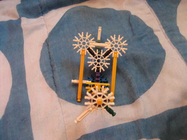 Foto 21-23: Añadir parte inferior izquierda. Foto 21: Bucle de alambre alrededor de los copos de nieve en sostenedor del alambre, con suficiente cable para llegar a la cima del interruptor. Foto 23: Observe cómo los clips en el interruptor.