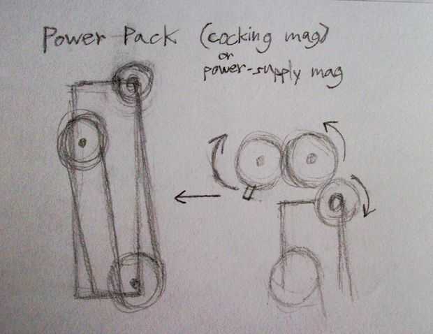 9 7: fuente de alimentación: una fuente de alimentación de armas que se almacena en un compartimiento en forma de dispositivo. Tiene una banda elástica, herida alrededor de un carrete pequeño, que está impedido de giro por un mecanismo de bloqueo. Cuando la batería se inserta en la pistola, se suelta el bloque y el bloque de armas se activa simultáneamente, poniendo la función de bloqueo en el control del disparador de armas de fuego. Cuando se tira del gatillo, el paquete de energía gira un perno giratorio a alta velocidad para disparar la pistola. -por Oblivitus