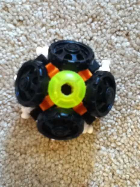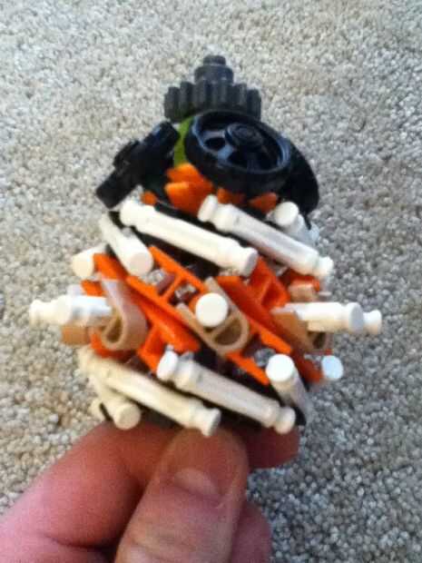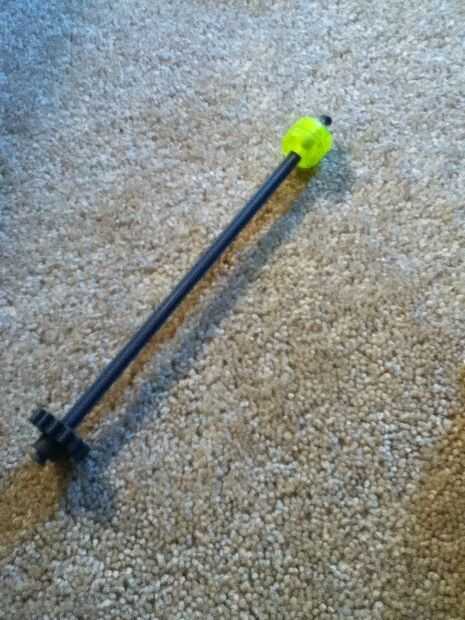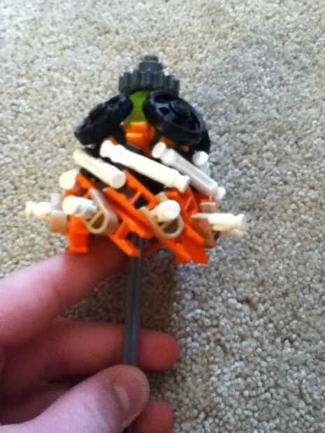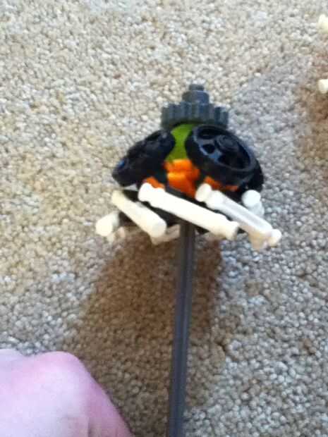 Tomar las dos cosas verdes y ponerlos en la parte superior de la bola. Tomar una encuesta larga gris y una atrás y seguir las fotos