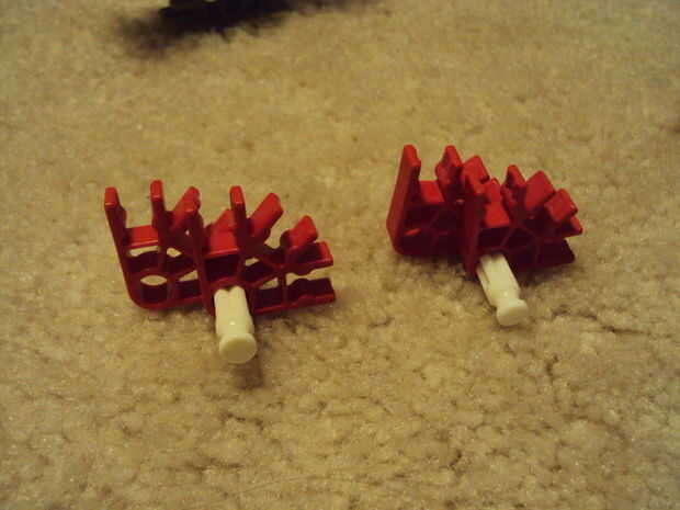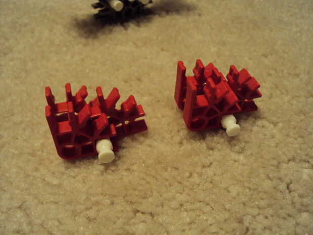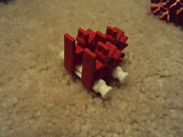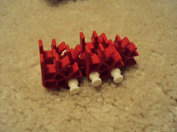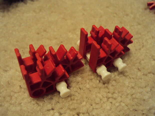 Primero hacer estas piezas, y luego añadir los dos conectores rojo. Ahora añadir una barra blanca a una de las partes. Línea tanto hacia arriba y acóplelos.