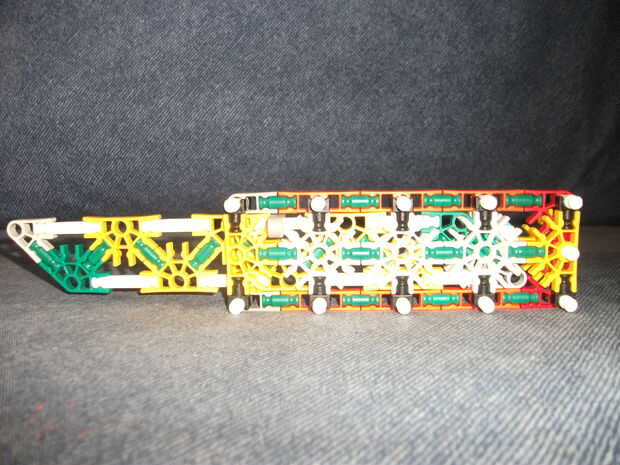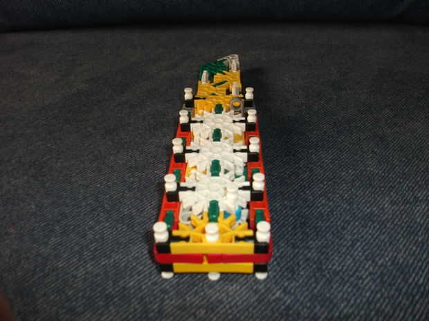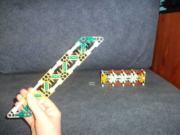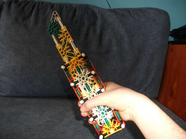 este cuchillo KVG es muy fácil de hacer y es bastante fuerte. Necesita: 10 conectores azules, 1 conector blanco oscuro, 1 conector verde, 3 conectores amarillo, 2 conectores naranja, 2 barras amarillas, 2 barras blancas, 3 barras verdes, 1 barra roja