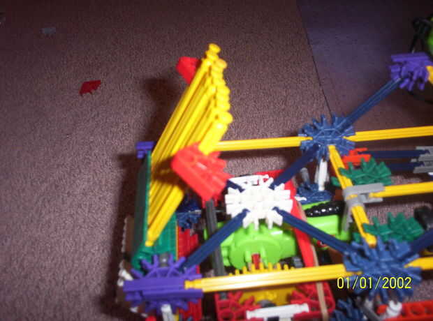 Hice un pequeño coche que cambia de dirección cada vez que golpea una pared, utilizando solamente un motor.Hay implicado un siete engranajes: engranajes rojo 4 (o 3), 2 engranajes amarillos y 1 engranaje azul.El coche es 1 barra gris largo, 1 barra r