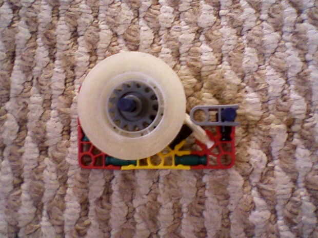 es un dispensador de cinta hecho únicamente con piezas de Lego, excepto la cinta sí mismo. Incluso corta utilizando una pieza de Lego. Hay un video explicando el montaje completo y funciona! También una ingeniosa pequeña historia sobre por qué constr