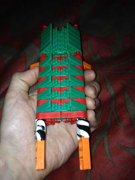 tiene dos barrilesmuy precisa y brotes bastante lejos sobre 50 si te pero bastantes bandas de goma entiene un alcance atiene una estructura muy fuerte y puede manejar mucha fuerzaPaso 1: mango 20 círculos rojos de 1/46 varillas blanco4 barras de amar