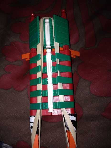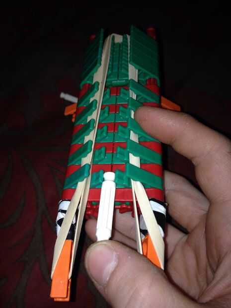 tiene dos barrilesmuy precisa y brotes bastante lejos sobre 50 si te pero bastantes bandas de goma entiene un alcance atiene una estructura muy fuerte y puede manejar mucha fuerzaPaso 1: mango 20 círculos rojos de 1/46 varillas blanco4 barras de amar