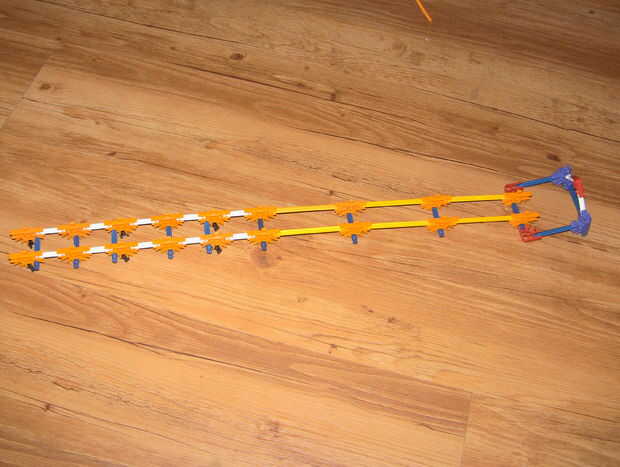 tiene dos barrilesmuy precisa y brotes bastante lejos sobre 50 si te pero bastantes bandas de goma entiene un alcance atiene una estructura muy fuerte y puede manejar mucha fuerzaPaso 1: mango 20 círculos rojos de 1/46 varillas blanco4 barras de amar