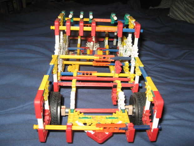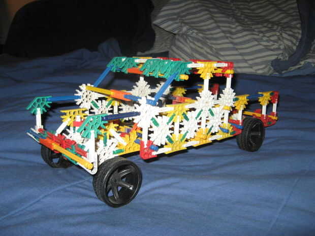 esto es una 4wd K'nex carro con puertas funcionales, un portón, acceso de baterías bajo el capó motor, un volante (dummy), cambio de marchas (dummy), asientos, llanta de repuesto y una cama. El sistema 4wd es rápidamente configurable para la impulsió