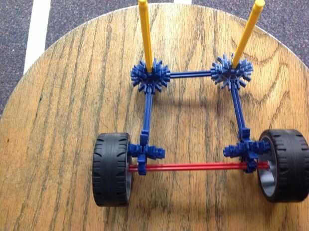 Hice un pequeño coche que cambia de dirección cada vez que golpea una pared, utilizando solamente un motor.Hay implicado un siete engranajes: engranajes rojo 4 (o 3), 2 engranajes amarillos y 1 engranaje azul.El coche es 1 barra gris largo, 1 barra r