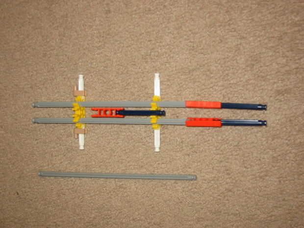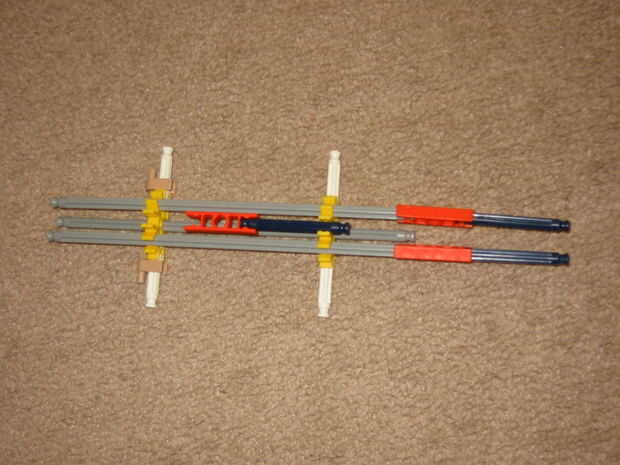 Crear el fuselaje superior, tal como se muestra y luego insertar la varilla gris en los dos agujeros de los conectores amarillos.