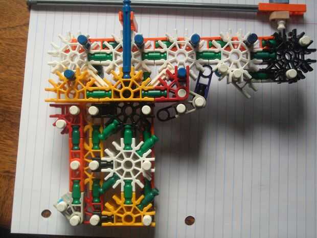 esta pistola dispara bastante lejos y es muy potente. Son las piezas que se necesita,2 cortarla13 conectores rojo4 barras azul3 barras de rojas o naranja5 conectores verdes2 conectores morados1 conector naranja1 barra verdeconector blanco 14 barras b