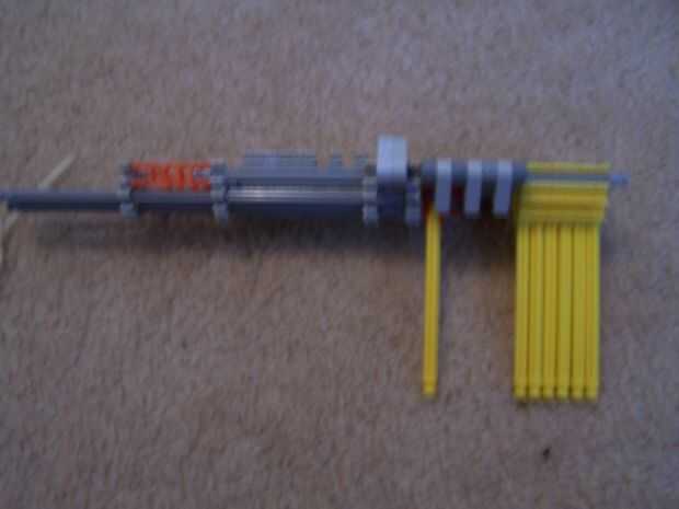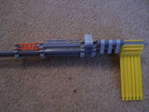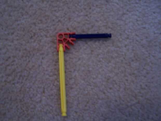4. la última pieza, con disparador insertado en barril. Insertar disparador poniendo azul en el barril amarillo en el extremo de la pistola y coser el otro extremo del gatillo a él. Esto hace que no caiga el gatillo de la pistola.